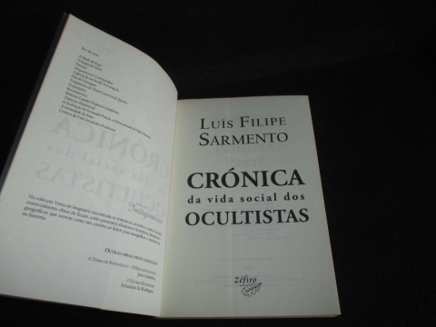 Capa de brochura. "A Crónica da Vida Social dos Ocultistas" é um livro instrutivo, irónico, corajoso, por vezes apaixonante, por vezes hilariante. Inicia-nos, com realismo e humor, em mistérios muito actuais. Assistimos a espectáculos mágicos, escutamos assombrosos discursos, planamos sobre o poder, a fraude e a ilusão, sobre crenças autênticas, mistificações e factos históricos. Só lendo… Aqui reencontramos o Luís Filipe Sarmento, ora escritor, ora jornalista, por vezes no seu melhor".