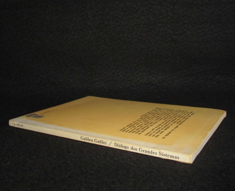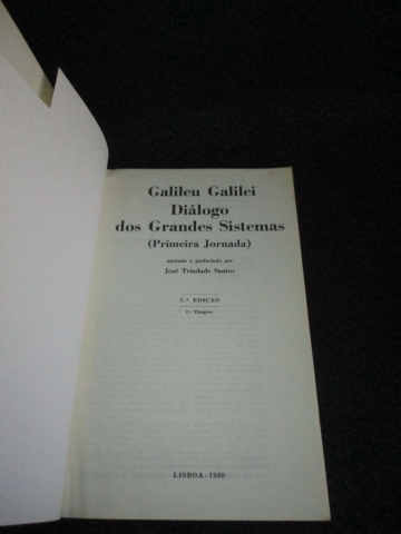Pequeno corte no frontispício. (Primeira Jornada). Capa de brochura. Ilustrado no texto com os esquemas geométricos explicativos. Anotado e prefaciado por José Trindade Santos. Tradução do original italiano do Diálogo que causou a polémica entre os crentes e os não crentes nos sistemas astronómicos heliocêntrico e geocêntrico.