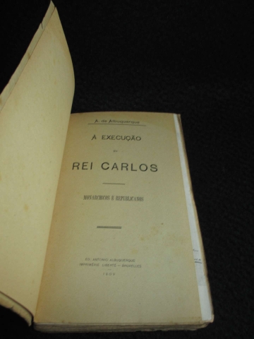 Monárquicos e Republicanos. Capa de brochura com sinais de uso, exemplar sem perdas estruturais graves. Ilustrado com uma reprodução em extratexto de um retrato do autor desenhado a carvão. A Execução do Rei Carlos (1909) é uma obra clandestina escrita por António de Albuquerque, aristocrata polémico e autor de O Marquês da Bacalhoa. Publicado com local e tipografia fictícios e datado no final em Madrid, onde o autor vivia exilado, o livro oferece um testemunho político e literário sobre o regicídio de 1908, combinando análise histórica com uma forte carga contestatária dirigida tanto à Monarquia como ao emergente republicanismo.