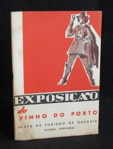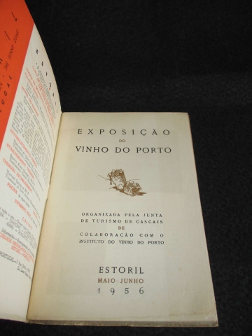 Capa de brochura. Ilustrado com fotografias e publicidade da época. Roteiro da Exposição do Vinho do Porto. Edição trilíngue português, inglês e francês. Organizada pela Junta de Turismo de Cascais de Colaboração com o Instituto do Vinho do Porto. Estoril Maio - Junho 1956. Composição e impressão Tipografia Cardim, Lda - Cascais.