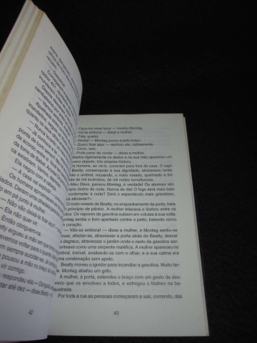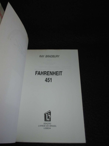 Obras-Primas da Ficção Científica. Capa de brochura. Tradução de Mário Henrique Leiria. Capa de A. Pedro. Guy Montag é um bombeiro. O seu emprego consiste em destruir livros proibidos e as casas onde esses livros estão escondidos. Ele nunca questiona a destruição causada, e no final do dia regressa para a sua vida apática com a esposa, Mildred, que passa o dia imersa na sua televisão. Um dia, Montag conhece a sua excêntrica vizinha Clarisse e é como se um sopro de vida o despertasse para o mundo. Ela apresenta-o a um passado onde as pessoas viviam sem medo e dá-lhe a conhecer ideias expressas em livros. Quando conhece um professor que lhe fala de um futuro em que as pessoas podem pensar, Montag apercebe-se subitamente do caminho de dissensão que tem de seguir.