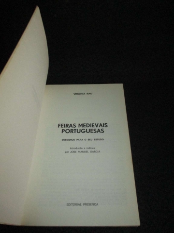 Subsídios para o seu estudo. Capa de brochura. Ilustrado com 2 mapas desdobráveis mostrando os tipos de feiras segundo a sua organização e por datas da sua fundação. Introdução e índices por José Manuel Garcia. Considerada um clássico da historiografia portuguesa contemporânea, permanece inultrapassada na investigação e estudo do essencial aspeto do mundo medieval que são a feiras. Algumas das feiras estudas neste volume: Ponte de Lima (1125), Melgaço (1181), Vila Nova de Famalicão (1205), Vila Mendo (1229), Guarda (1255), Guimarães (1258), Covilhã (1260), Elvas (1262), Vila Real (1272), Loulé (1291), Lamego (1292), […].