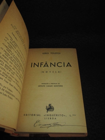 Assinatura de posse. Novela. Encadernação meia francesa com lombada e cantos em pele. Ferros e títulos gravados a ouro na lombada. Tradução e prefácio de Adolfo Casais Monteiro. A obra literária de Leão Tolstoi tem sido descrita como «um enorme diário mantido ao longo de mais de cinquenta anos». Esse diário tem início com Infância, o primeiro livro que Tolstoi publicou, quando tinha apenas vinte e três anos. É uma obra semi-autobiográfica que relata a infância de Nikolai Irteniev aos dez anos de idade, recriando pessoas, locais e acontecimentos com a vivacidade de uma criança, enriquecida pela irónica compreensão retrospectiva de um adulto. Pouco tempo depois, seguiram-se Adolescência e Juventude, e Tolstoi lançou-se numa carreira literária que lhe viria a dar a imortalidade.