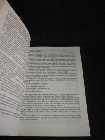 Assinatura de posse. Capa de brochura. O livro apresenta uma visão abrangente do olimpismo moderno, analisando a evolução histórica e conceptual desde Pierre de Coubertin até Juan Antonio Samaranch. A abordagem combina informação factual, enquadramento histórico e reflexão crítica, tornando o volume útil tanto para consulta como para estudo. A obra destaca-se pela clareza, pela organização temática e pela capacidade de aproximar o leitor dos valores, desafios e transformações do movimento olímpico no século XX.