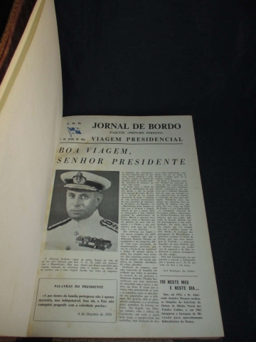 O “Jornal de Bordo” (jornal diário) refere-se à viagem oficial do Presidente da República Portuguesa, Américo Tomás, realizada a bordo do paquete Príncipe Perfeito da Companhia Nacional de Navegação (C.N.N.), iniciada em 7 de julho de 1964. Trata-se de um documento histórico que regista os eventos diários, escalas e cerimónias da viagem presidencial rumo às antigas colónias africanas.
