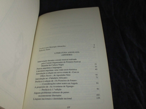 (Opiniões). Capa de brochura. "Reúnem-se neste volume intervenções e algumas considerações sobre questões culturais angolanas que entre outras foi necessário abordar no decurso de conferências, encontros, missões recebidas para o efeito, durante a primeira guerra de libertação nacional a após a independência. (da contracapa)