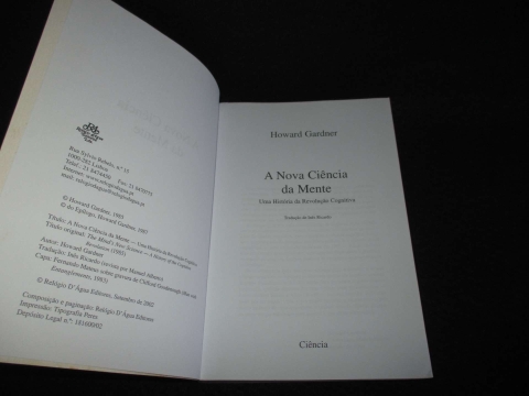 Uma história da Revolução Cognitiva. Capa de brochura. A ciência cognitiva é considerada um ramo científico novo, e até meados da década de 1970 contava com parca bibliografia. Howard Gardner ilustra neste livro o desenvolvimento dessa “ciência da mente” desde os seus primeiros anos, relacionando disciplinas aparentemente díspares. Na sua pesquisa, investigou as origens filosóficas e históricas dos respectivos campos envolvidos, e entrevistou inúmeros cientistas dedicados ao tema, apresentando um panorama dos trabalhos atuais na área, incluindo suas próprias perspectivas sobre o futuro da ciência. Para o autor, “o domínio da ciência cognitiva consiste no acúmulo de conhecimento sobre a cognição humana, através do estudo acadêmico disciplinar e (cada vez mais) interdisciplinar”. Trata-se de um livro fundamental a todos que pretendem desenvolver estudos ou pesquisas na área. Psicologia.