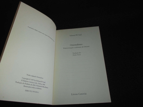 Representações ocidentais do Oriente. Capa de brochura. Tradução de Pedro Serra. Como representamos outra cultura? O que é outra cultura? Será que a noção de uma cultura distinta (ou raça, ou religião, ou civilização) é útil, ou será que sempre se envolve em auto-satisfação (quando analisamos a nossa) ou em hostilidade e agressão (quando analisamos a 'outra')? As diferenças culturais, religiosas e raciais importam mais que as categorias sócio-económicas ou que as categorias político-históricas? Como é que as ideias chegam a adquirir autoridade, 'normalidade' e até mesmo o estatuto de verdades 'naturais'? Qual é o papel do intelectual? Existe para dar validade à cultura e ao estado a que pertence? Que importância deve o intelectual atribuir a uma consciência crítica independente, a uma consciência crítica de oposição? Estas são algumas das questões que esta obra de referência universal procura elucidar.
