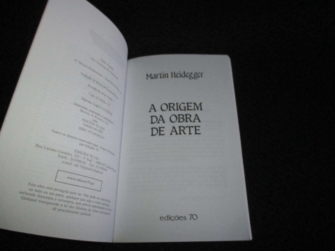 Capa de brochura. A arte é um enigma. Nela se revela e esconde a verdade daquilo que é. Heidegger pretende mostrar-nos como, através da obra, poderemos aperceber-nos do outro lado das coisas e como deveremos utilizar o que vemos como ponto de partida para uma reflexão sobre o sentido último da arte.
