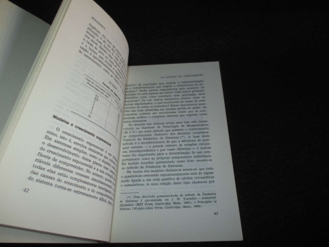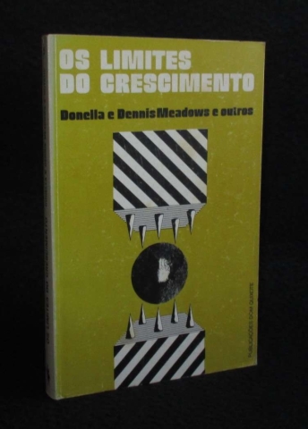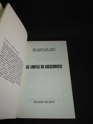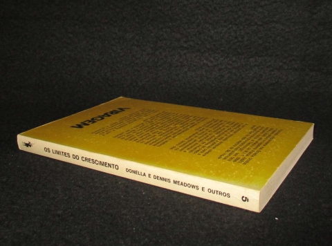 Capa de brochura. Ilustrado. Obra em que os autores Donella H. Meadows, Dennis L. Meadows, Jørgen Randers e William W. Behrens III sintetizam o trabalho de uma equipa de investigadores do MIT que, a pedido do grupo de reflexão Clube de Roma, usou a melhor capacidade computacional da altura e um modelo de dados para desenhar cenários para o futuro do planeta e da humanidade a partir da análise da evolução da população, da produção de alimentos, da industrialização, da poluição e da exploração de recursos não renováveis. Política Internacional.