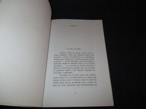 Primeira edição da obra poética de Eduardo White, um dos nomes centrais da literatura moçambicana contemporânea e figura ligada à renovação literária promovida pela revista Charrua. O livro reúne dois conjuntos de poemas marcados por intensidade emocional, reflexão identitária e uma linguagem sensorial que caracteriza a escrita do autor. É uma edição procurada por leitores de poesia africana e por colecionadores de literatura lusófona.