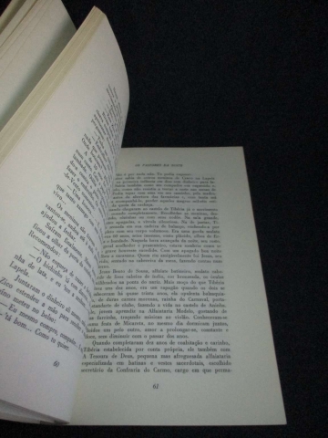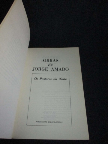 Capa de brochura. Os Pastores da Noite é um romance com cenário na cidade da Baía, as ruas antigas, as suas ladeiras, as rodas de capoeira, o popular, mágico e misterioso ambiente desta terra. O povo pobre da cidade, um Jesuíno Galo Doido, sábio, vagabundo e mestre da vida, um cravo na Lapela, larápio justificado, um cabo Martim e sua Marialva, uma sonhadora Otália, toda a riquíssima galeria de personagens tão comuns em Jorge Amado. Os Pastores da Noite é, ora romântico, ou de duro humorismo, um dramático testemunho de gente humilde de todo o mundo.