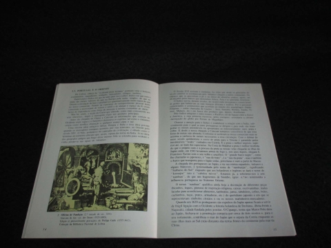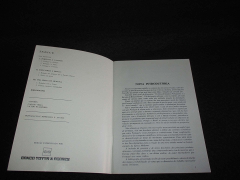 Capa de brochura. Ilustrado no texto com fotografias a cores e monocromáticas e gravuras a preto e branco. XVII Exposição Europeia de Arte, Ciência e Cultura. Os Descobrimentos Portugueses e a Europa do Renascimento. Do índice: I – Portugal e o mundo; II – Especiarias e Drogas; III – Uma Época de Mudança.