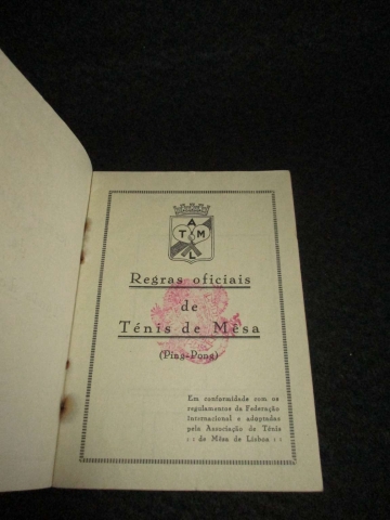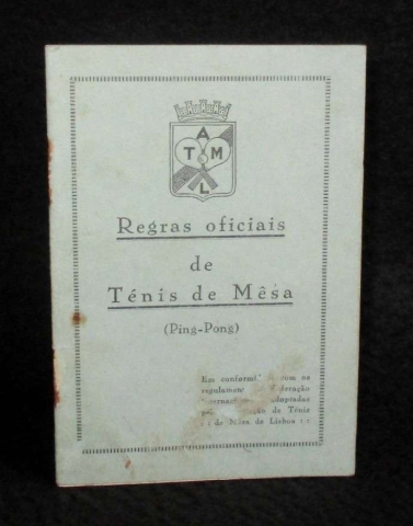 Documento raro e de interesse histórico para o estudo da modalidade em Portugal. Em conformidade com os regulamentos da Federação Internacional e adoptadas pela Associação de Ténis de Mêsa de Lisboa. Brochado. Exemplar autenticado com timbre institucional da Associação de Ténis de Mesa de Lisboa e selo seco em relevo, com o número 311 ao centro, aplicado sobre a folha final do livro. Exemplar em bom estado.