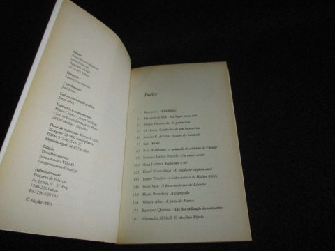 Capa de brochura. Boccaccio / Marquês de Sade / Fiódor Dostoievski / O. Henry / Jerome / K. Jerome / Saki / P. G. Wodehouse / Enrique Jardiel Poncela / Ring Lardner / Dezsö Kosztolányi / James Thuber / Boris Vian / Mario Benedetti / Woody Allen / Raymond Queneau / Alexandre O’Neill.
