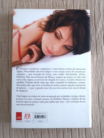 Christian é excêntrico, enigmático, o mais famoso recluso da aristocracia inglesa. Vive isolado, não tem amigos e o seu coração nunca foi tomado por ninguém… com excepção de Leona, uma mulher determinada, exótica, belíssima. Mas isso aconteceu em Macau, naquela que parece ter sido uma outra vida. As notícias da chegada de Leona a Londres deixam-no aturdido. Christian decide então que nada o impedirá de finalmente a possuir. Não podia saber que entre as famílias de ambos pulsam segredos impossíveis de ignorar… e que o grande amor da sua vida acalenta um mortal desejo de vingança! Uma viagem no tempo até uma era marcada por escândalos, intriga e desejos secretos, no novo e sensual romance de Madeline Hunter: a história de um homem capaz de arriscar tudo pela mulher que ama - até a revelação do seu mais secreto pecado.