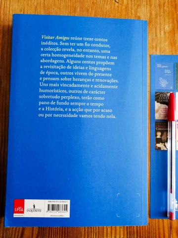 Visitar Amigos reúne treze contos inéditos. Sem ter um fio condutor, a colecção revela, no entanto, certa homogeneidade nos temas e nas abordagens. Alguns contos propõem a revisitação de ideias e linguagens de época, outros vivem do presente e pensam sobre heranças e renovações. Uns mais vincadamente e acidamente humorísticos, outros de carácter sobretudo perplexo, terão como pano de fundo sempre o tempo e a História, e a acção que por acaso ou por necessidade vamos tendo nela.
