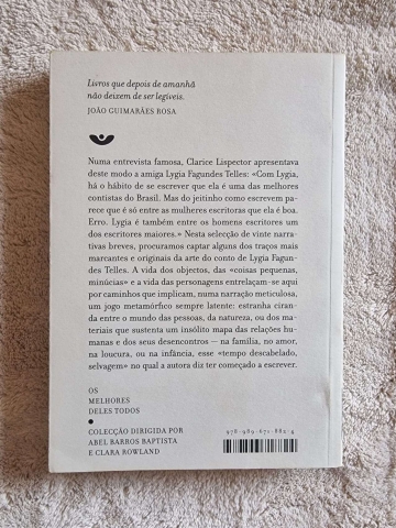 Nesta selecção de vinte narrativas breves, procuramos captar alguns dos traços mais marcantes e originais da arte do conto de Lygia Fagundes Telles. A vida dos objectos, das coisas pequenas, minúcias e a vida das personagens entrelaçam-se aqui por caminhos que implicam, numa narração meticulosa, um jogo metamórfico sempre latente: estranha ciranda entre o mundo das pessoas, da natureza, ou dos materiais que sustenta um insólito mapa das relações humanas e dos seus desencontros — na família, no amor, na loucura, ou na infância, esse tempo descabelado, selvagem no qual a autora diz ter começado a escrever.