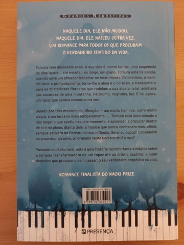 Tomura tem dezasseis anos. A sua vida é, como tantas, uma sequência de dias iguais… até escutar, ao longe, um piano. Tomura está na escola, quando ouve um afinador trabalhar no instrumento. de imediato, a melodia toca-o profundamente, toma-lhe a alma e o coração, e transporta-o para as misteriosas florestas que rodeiam a sua aldeia natal, aninhada nas escarpas de uma montanha. Há bruma, negrume, luz. e há, agora, um rapaz que parece nascer outra vez.