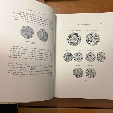 Importantíssimo trabalho numismático, do maior interesse para a história do aparecimento das primeiras moedas cunhadas em Portugal: Considerações acerca de costumes e épocas, ambiente económico-social e circunstancias em que aparece e se desenvolve a moeda de Portugal; Reprodução fotográfica de todas as peças que compõe as numárias de todos os soberanos da dinastia afonsina ou de Borgonha, que institui, engrandece e consolida o edifício da Nação Portuguesa; Arrumação cronológica e sistemática das moedas em cada reinado, com anotações sobre quantidade conhecida, ou sua raridade, valores numismáticos e preços de transacções; Sinais e selos autenticativos usados nas chancelarias reais; documentos e diplomas que dizem respeito ou interessam às várias amoedações de bolhão, ouro e prata; Bibliografia. Edição de muito apurada execução gráfica, em bom papel e ilustrada com numerosas reproduções de moedas, selos pendentes e outras gravuras, nas páginas de texto e em folhas à parte.