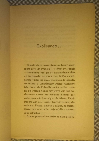 É um ensaio crítico do escritor, pois Camacho era uma figura republicana proeminente e este livro surgiu como resposta a uma obra francesa intitulada "Carlos 1er, Intime" de Colleville. A obra de Brito Camacho utiliza o livro francês como pretexto para criticar a dinastia e a figura de D. Carlos, numa perspetiva liberal e republicana da época.