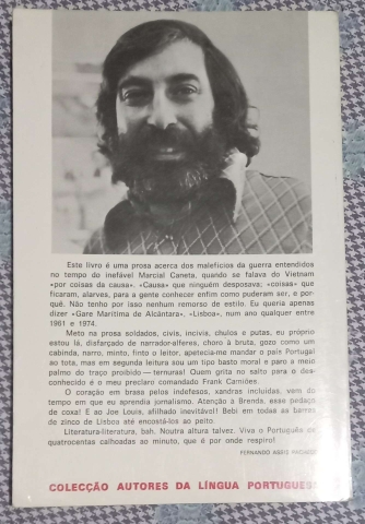 "Este livro é uma prosa acerca dos malefícios da guerra entendidos no tempo do inefável Marcial Caneta, quando se falava do Vietname «por coisas da causa. «Causa que ninguém desposava; «coisas que ficaram, alarves, para a gente conhecer enfim como puderam ser, e porquê. Não tenho por isso nenhum remorso de estilo. Eu queria apenas dizer «Gare Marítima de Alcântara, Lisboa, num ano qualquer entre 1961 e 1974. Meto na prosa soldados, civis, incivis, chulos e putas, eu próprio estou lá, disfarçado de narrador-alferes, choro à bruta, gozo como um cabinda, narro, minto, finto o leitor, apetecia-me mandar o país Portugal ao tota, mas em segunda leitura sou um tipo basto moral e paro a meio palmo do traço proibido ternuras! Quem grita no salto para o desconhecido é o meu preclaro comandado Frank Camiões. O coração em brasa pelos indefesos, xandras incluídas, vem do tempo em que eu aprendia jornalismo.