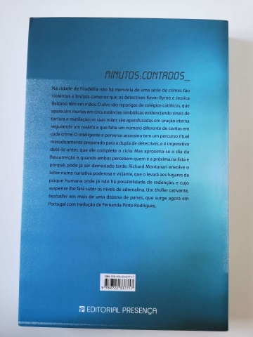 Na cidade de Filadélfia não há memória de uma série de crimes tão violentos e brutais como os que os detectives Kevin Byrne e Jessica Balzano têm em mãos. O alvo são raparigas de colégios católicos, que aparecem mortas em circunstâncias simbólicas evidenciando sinais de tortura e mutilação: as suas mãos são aparafusadas em oração eterna segurando um rosário a que falta um número diferente de contas em cada crime. O inteligente e perverso assassino tem um percurso ritual metodicamente preparado para a dupla de detectives, e é imperativo detê-lo antes que ele complete o ciclo. Mas aproxima-se o dia da Ressureição e, quando ambos percebem quem é a próxima na lista e porquê, pode já ser demasiado tarde. Richard Montanari envolve o leitor numa narrativa poderosa e viciante, que o levará aos lugares da psique humana onde já não há possibilidade de redenção, e cujo suspense lhe fará subir os níveis de adrenalina. Um thriller cativante, bestseller em mais de uma dezena de países, que surge agora em Portugal com tradução de Fernanda Pinto Rodrigues.