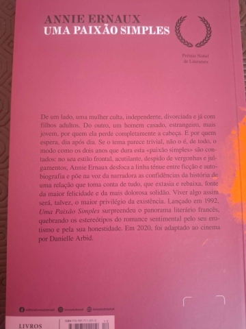 De um lado, uma mulher culta, independente, divorciada e já com filhos adultos. Do outro, um homem casado, estrangeiro, mais jovem, por quem ela perde completamente a cabeça. E por quem espera, dia após dia. Se o tema parece trivial, não o é, de todo, o modo como os dois anos que dura esta «paixão simples» são contados: no seu estilo frontal, acutilante, despido de vergonhas e julgamentos, Annie Ernaux desfoca a linha ténue entre ficção e autobiografia e põe na voz da narradora as confidências da história de uma relação que toma conta de tudo, que extasia e rebaixa, fonte da maior felicidade e da mais dolorosa solidão. Viver algo assim será, talvez, o maior privilégio da existência. Lançado em 1992, Uma Paixão Simples surpreendeu o panorama literário francês, quebrando os estereótipos do romance sentimental pelo seu erotismo e pela sua honestidade. Em 2020, foi adaptado ao cinema por Danielle Arbid