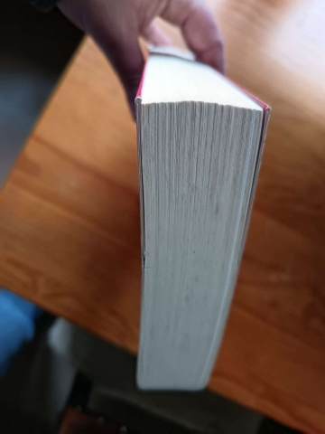 Tem um vinco na lombada, mais na parte inferior, e tem manchas no exterior das folhas.