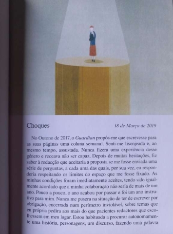"No Outono de 2017, o Guardian propôs-me que escrevesse para as suas páginas uma coluna semanal. Senti-me lisonjeada e, ao mesmo tempo, assustada. Nunca fizera uma experiência desse género e receava não ser capaz. Depois de muitas hesitações, fiz saber à redacção que aceitaria a proposta se me fosse enviada uma série de perguntas, a cada uma das quais, por sua vez, eu responderia respeitando os limites do espaço que me fosse fixado."
