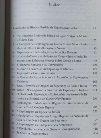 Regista o subsequente desenvolvimento dos serviços secretos na condução da política dos Estados em períodos tão diversos como a Veneza renascentista, a Inglaterra de Isabel I, a França do Ancien Régime, a América revolucionária e a Rússia czarista.