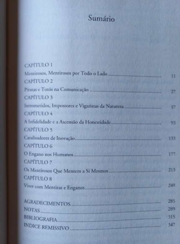 Combinando as descobertas científicas mais recentes com um número elevado de exemplos sugestivos, o zoólogo Lixing Sun evidencia o modo como, na Natureza, a impostura assenta em duas regras básicas: a primeira é a mentira, pela qual os impostores alteram o significado de mensagens honestas na comunicação para servirem interesses próprios; a segunda é a exploração pelos impostores das fraquezas e dos défices nos sistemas cognitivos das outras criaturas. Lixing Sun demonstra que a mentira é um poderoso catalisador da disputa evolucionária entre o vigarista e o vigarizado, dela resultando um mundo biológico repleto de complexidade e beleza.