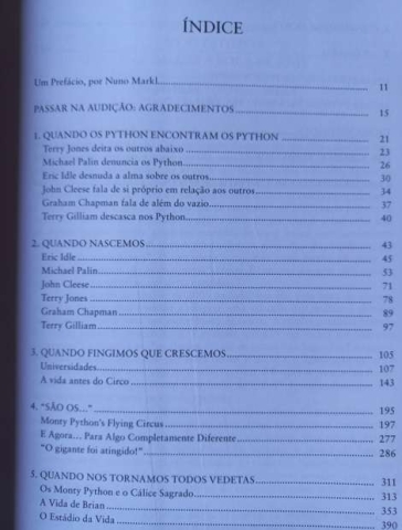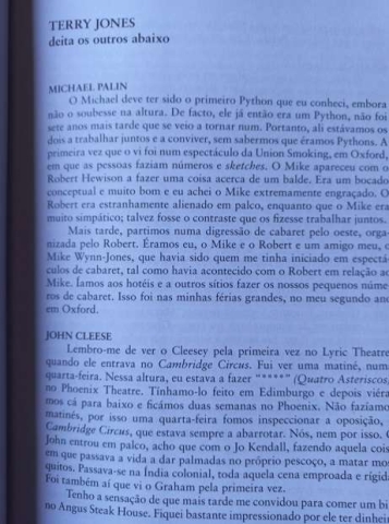 Em 1969, seis Ingleses (bem, um era Galês e outro um Americano intrometido) juntaram-se para criar um programa de televisão sobre um agente teatral sem escrúpulos, desonesto e francamente asqueroso, chamado Monty Python. O Monty Python’s Flying Circus mudou a face da comédia televisiva e agora, mais do que há quatrocentos anos atrás (bem, de facto, trinta anos e mais um bocado), as pessoas continuam a falar sobre ele. Aqui está, nas suas próprias palavras e nos extractos dos diários pessoais, a história completa dos Monty Python.