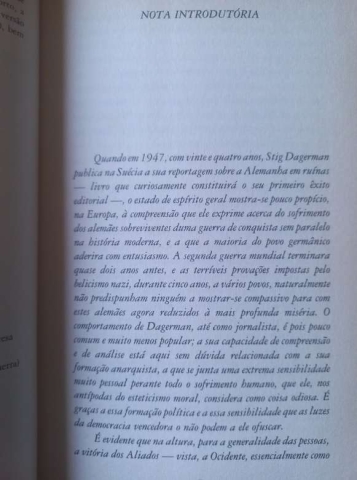 No rescaldo da Segunda Guerra Mundial, quando a imprensa internacional retratava os escombros germânicos como um castigo merecido, Stig Dagerman derramava uma clarividente compaixão sobre os derrotados, questionando o prisma dos vencedores e o direito de humilharem um povo espezinhado.