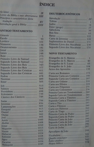 Observações: Com Licença da Conferência Episcopal Portuguesa; Tradução interconfessional do hebraico, do aramaico e do grego; Inclui: O Velho Testamento, O Novo Testamento, Índices, Princípios e Caraterísticas desta Tradução, Introdução Geral Á Bíblia, Introdução a Cada Livro, Notas, Vocabulário, Quadro Cronológico, Índice Analítico e Mapas.