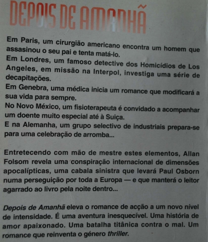 Depois de Amanhã eleva o romance de acção a um novo nível de intensidade. É uma aventura inesquecível. Uma história de amor apaixonado. Uma batalha titânica contra o mal. Um romance que reinventa o género thriller.