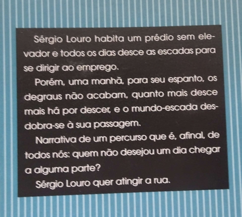 Sérgio Louro habita um prédio sem elevador e todos os dias desce as escadas para se dirigir ao emprego. Porém, uma manhã, para seu espanto, os degraus não acabam, quanto mais desce mais há por descer, e o mundo-escada desdobra-se à sua passagem.
