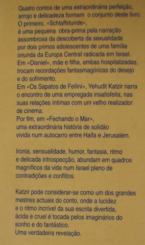 Neste livro Yehudit Katzir, escritora israelita considerada um dos grandes mestres actuais do conto, reuniu quatro contos que nos revelam quadros magníficos da vida de um Israel repleto de contradições e conflitos. Em Schlaffstunde podemos acompanhar a descoberta da sexualidade de dois primos, adolescentes, de uma família oriunda da Europa Central e que foi viver para Israel. Em Disniel encontramos uma mulher e a sua filha. Estão as duas hospitalizadas e ocupam o tempo trocando recordações fantasmagóricas de desejo e sofrimento. Os Sapatos de Fellini é a narração do encontro de uma empregada, que não está satisfeita com as suas relações íntimas, com um velho realizador de cinema. Fechando O Mar é, por seu lado, uma espantosa história de solidão vivida num autocarro, ao longo do percurso entre as cidades de Haifa e Jerusalém.