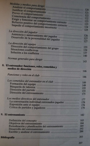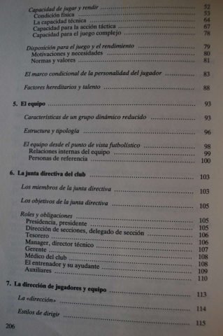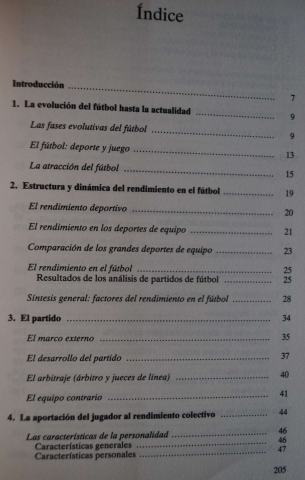 A evolução do futebol até hoje; Estrutura e dinâmica de desempenho; Fatores de desempenho; O desenvolvimento do partido; O árbitro e os bandeirinhas; A performance coletiva; A equipe; A diretoria do clube; A gestão da equipe; O treinador; Preparação mental e motivações; Treinamento tático e técnico