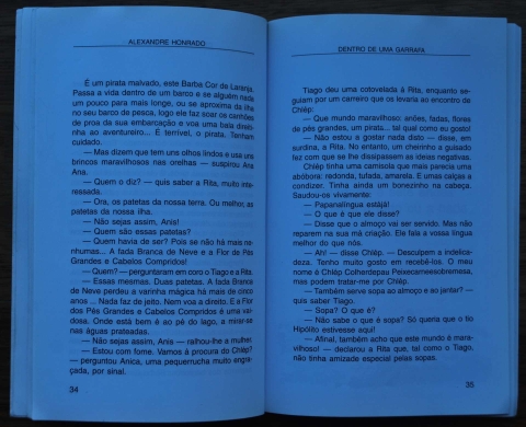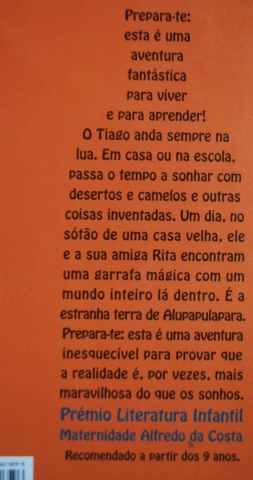 Um dia, a namorada do tio Hipólito, a Mafalda, mais a sua filha Rita, tinham combinado ir ao Palácio da Lua Nova. Tiago, cheio de curiosidade, foi também. Quando chegaram ficaram todos a admirar as velharias daquele Palácio. Tiago e Rita subiram umas escadas que iam ter a um sótão. Nesse sótão havia outras escadas ainda maiores. Rita encontrou uma garrafa de vidro, onde na rolha estavam gravadas umas letras. Rita decidiu descer aquelas escadas todas para ir buscar uma lupa. Pegaram nela e observaram, com atenção, as letras da rolha, mas estas não faziam sentido Alupapulapara. Tiago repetiu três vezes esta palavra e, de repente, começaram a ficar pequeninos e entraram na garrafa. Dentro da garrafa existiam duas ilhas Alupapulapara e Trupalupapara. Quando Rita e Tiago chegaram a Alupapulapara encontraram Anis e Ana Ana que eram dois habitantes da ilha. Anis e Ana Ana apresentaram os seus filhos, os cinco anicos, que se chamavam Anil, Anel, Andor, Anica e Âncora. Também apresentaram o seu cozinheiro, o Chlép. Nessa ilha, havia um pirata que não deixava ninguém passar para Trupapulapara. Um dia esse pirata feriu a asa de uma bela fada.