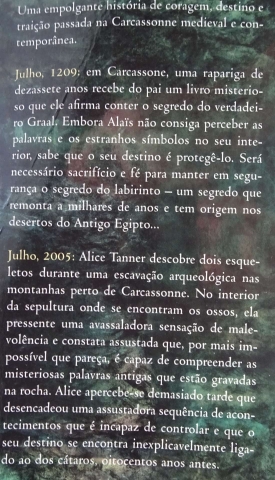 Em Julho de 1209: em Carcassone, uma rapariga de dezassete anos recebe do pai um livro misterioso que ele afirma conter o segredo do verdadeiro Graal. Embora Alaïs não consiga perceber as palavras e os estranhos símbolos no seu interior, sabe que o seu destino é protegê-lo. Será necessário sacrifício e fé para manter em segurança o segredo do labirinto - um segredo que remonta a milhares de anos e tem origem nos desertos do Antigo Egipto... Em Julho de 2005: Alice Tanner descobre dois esqueletos durante uma escavação arqueológica nas montanhas perto de Carcassonne. No interior da sepultura onde se encontram os ossos, ela pressente uma avassaladora sensação de malevolência e constata assustada que, por mais impossível que pareça, é capaz de compreender as misteriosas palavras antigas que estão gravadas na rocha. Alice apercebe- se demasiado tarde que desencadeou uma assustadora sequência de acontecimentos que é incapaz de controlar e que o seu destino se encontra inexplicavelmente ligado ao dos cátaros, oitocentos anos antes.