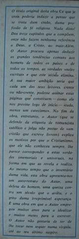 A sua ambição seria que cada um dos seus leitores, crente ou não-crente, pudesse assinar estas páginas que constituem - como ele nos previne logo no início - «tudo, menos um catecismo. No fim da obra, entretanto o Autor (que se defende da etiqueta de romancista católico e julga não passar de «um cristão que escreve livros) explica os motivos por que o Cristianismo, que ele conheceu sempre, lhe parece corresponder a estas verdades imemoriais e universais, na forma em que as revela e realiza.