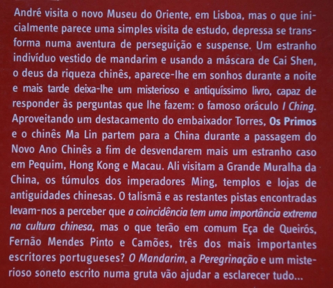 André visita o novo Museu do Oriente, em Lisboa, mas o que inicialmente parece uma simples visita de estudo, depressa se transforma numa aventura de perseguição e suspense. Um estranho indivíduo vestido de mandarim e usando a máscara de Cai Shen, o deus da riqueza chinês, aparece-lhe em sonhos durante a noite e mais tarde deixa-lhe um misterioso e antiquíssimo livro, capaz de responder às perguntas que lhe fazem: o famoso oráculo I Ching. Aproveitando um destacamento do embaixador Torres, Os Primos e o chinês Ma Lin partem para a China durante o Novo Ano Chinês a fim de desvendarem mais um estranho caso em Pequim, Hong Kong e Macau. Ali visitam a Grande Muralha da China, os túmulos dos imperadores Ming, templos e lojas de antiguidades chinesas. O talismã e as restantes pistas encontradas levam-nos a perceber que a coincidência tem uma importância extrema na cultura chinesa, mas o que terão em comum Eça de Queirós, Fernão Mendes Pinto e Camões, três dos mais importantes escritores portugueses? O Mandarim, a Peregrinação e um misterioso soneto escrito numa gruta vão ajudar a esclarecer tudo…