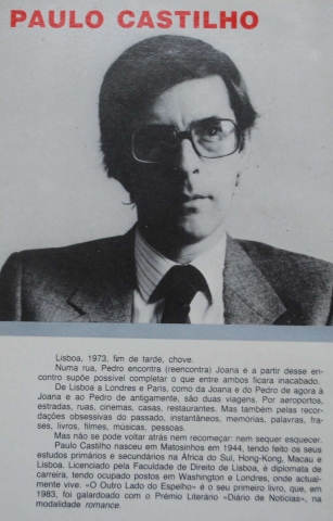 Lisboa, 1973, fim de tarde, chove. Numa rua, Pedro encontra (reencontra) Joana e a partir desse encontro supõe possível completar o que entre ambos ficara inacabado. De Lisboa a Londres e Paris, como da Joana e do Pedro de agora à Joana e ao Pedro de antigamente, são duas viagens. Por aeroportos, estradas, ruas, cinemas, casas, restaurantes. Mas também pelas recordações obsessivas do passado, instantâneos, memórias, palavras, frases, livros, filmes, músicas, pessoas. Mas não se pode voltar atrás nem recomeçar: nem sequer esquecer. Paulo Castilho nasceu em Matosinhos em 1944, tendo feito os seus estudos primários e secundários na África do Sul, Hong-Kong, Macau e Lisboa. Licenciado pela Faculdade de Direito de Lisboa, é diplomata de carreira, tendo ocupado postos em Washington e Londres, onde actualmente vive. «O Outro Lado do Espelho» é o seu primeiro livro, que, em 1983, foi galardoado com o Prémio Literário «Diário de Notícias», na modalidade romance.