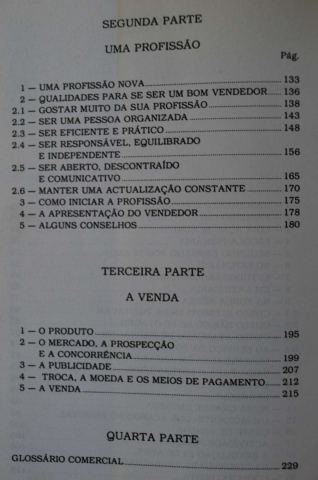As qualidades que fazem do vendedor um bom profissional e o seu relacionamento com os clientes, o Produto, o Mercado, a Concorrência, a Publicidade, os Meios de Pagamento e a VENDA, são assuntos importantes tratados neste livro que pode ser lido e apreciado por qualquer pessoa, porque está escrito numa linguagem simples, clara, sincera, mas quente e rica em ensinamentos práticos.