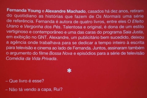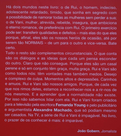 E a aprender que a normalidade não existe. Por isso não sabemos lidar com ela. Rui e Vani foram criados para a televisão pela escritora Fernanda Young e pelo publicitário e argumentista Alexandre Machado. que só podiam mesmo ser casados. Na TV a série de Rui e Vani é impagável. No livro o prazer de os conhecer é mais imparável.
