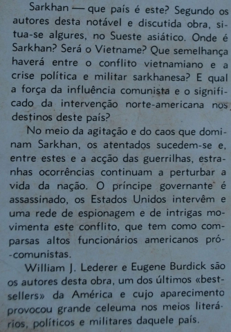 Sarkhan - que país é este? Segundo os autores desta notável obra, situa-se algures, no Sueste asiático. Onde é Sarkhan? Será o Vietname? Que semelhança haverá entre o conflito vietnamiano e a crise política e militar sarkhanesa? E qual a força da influência comunista e o significado da intervenção norte-americana nos destinos deste país.