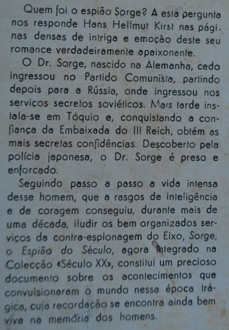 Seguindo passo a passo a vida intensa desse homem, que a rasgos de inteligência e de coragem conseguiu, durante mais de uma década, iludir os bem organizados serviços da contra -espionagem do Eixo, Sorge, o Espião do Século, constitui um precioso documento sobre os acontecimentos que convulsionaram o mundo nessa época trágica, cuja recordação se encontra ainda bem viva na memória dos homens.