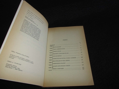 Tudo sobre plantação, cultivo e tratamento. Como plantar, cultivar e cuidar. Capa de brochura. Ilustrado. Plantar um pomar; O meio: condições de sucesso; Conhecer a árvore; Preparação e conservação do terreno; As árvores de fruto; Formas e variedades; Como ter boas colheitas; Estabelecimento do pomar; Protecção contra doenças e insectos; Colheita e conservação.