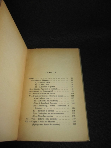 Capa de brochura. Obra ensaística de reflexão filosófica e cultural, onde Fidelino de Figueiredo, crítico literário, historiador e pensador humanista, articula uma leitura entre dois mundos: o da tradição clássica e o da modernidade em transformação. Num intróito anedótico o autor faz uma perquirição sobre os estragos da doença e da velhice no poder de penetração e na clareza do pensamento. Depois parte para uma longa excursão acerca da maneira de conceber a história, à qual sucede um relance pelas novas correntes de filosofia da história. E à luz desta disciplina considera o que a muitos parece o obstáculo maior à paz e à segurança: o antagonismo Leste-Oeste. Todo o livro expressa um esforço dialéctico de apaziguamento interior, pedindo ao entusiasmo pela obra da inteligência razões de confiar na espécie humana, novo gosto de viver e defesa sorridente contra os absurdos da existência. Do índice: I. Velhice e Literatura; II. História: Aparência e realidade; III. Histeria ou Estruturação?; IV. Grandes manchas da história; V. O anti-eslavismo e a filosofia da história; VI. Vida - Palavra sem antonimo; VII. Viagem à volta do Homem.